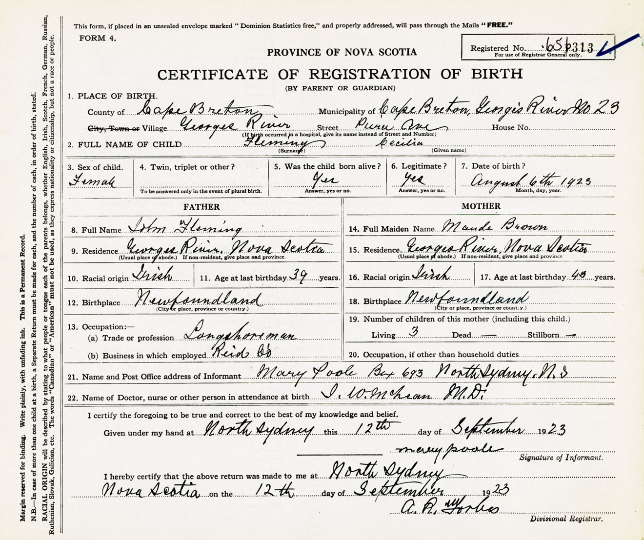 Female Birth Registration: Year: 1923 number: 65600313