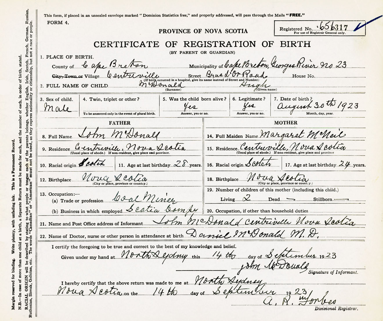 Male Birth Registration: Year: 1923 number: 65600317