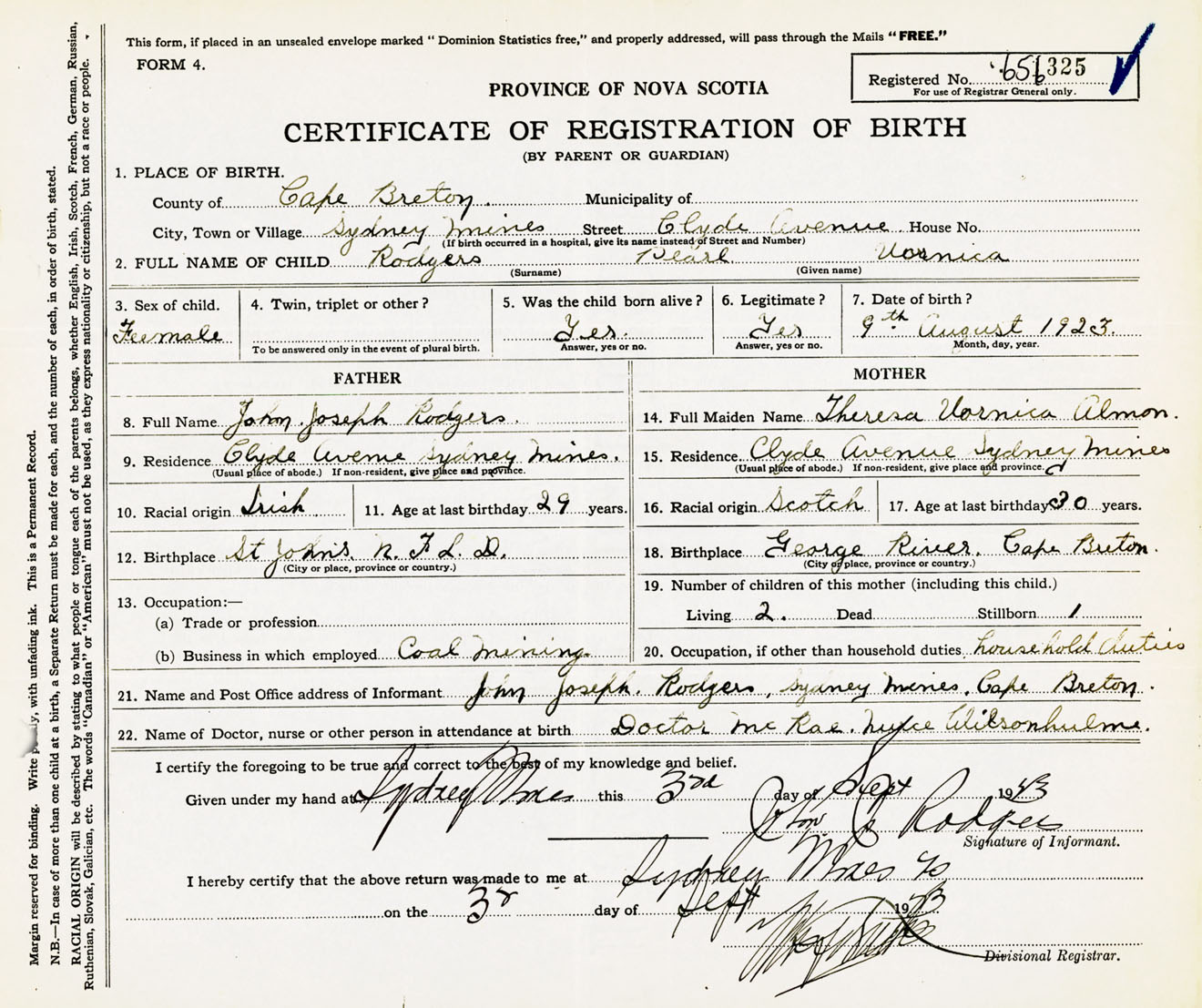 Female Birth Registration: Year: 1923 number: 65600325
