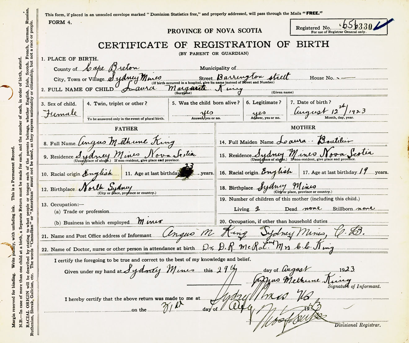 Female Birth Registration: Year: 1923 number: 65600330