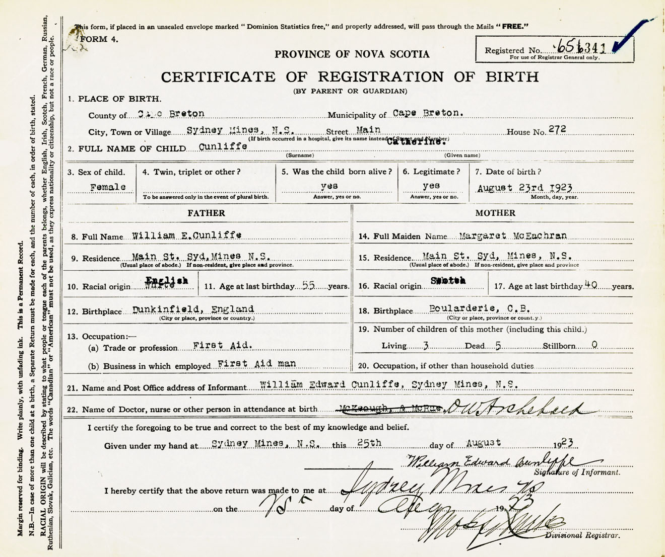 Female Birth Registration: Year: 1923 number: 65600341