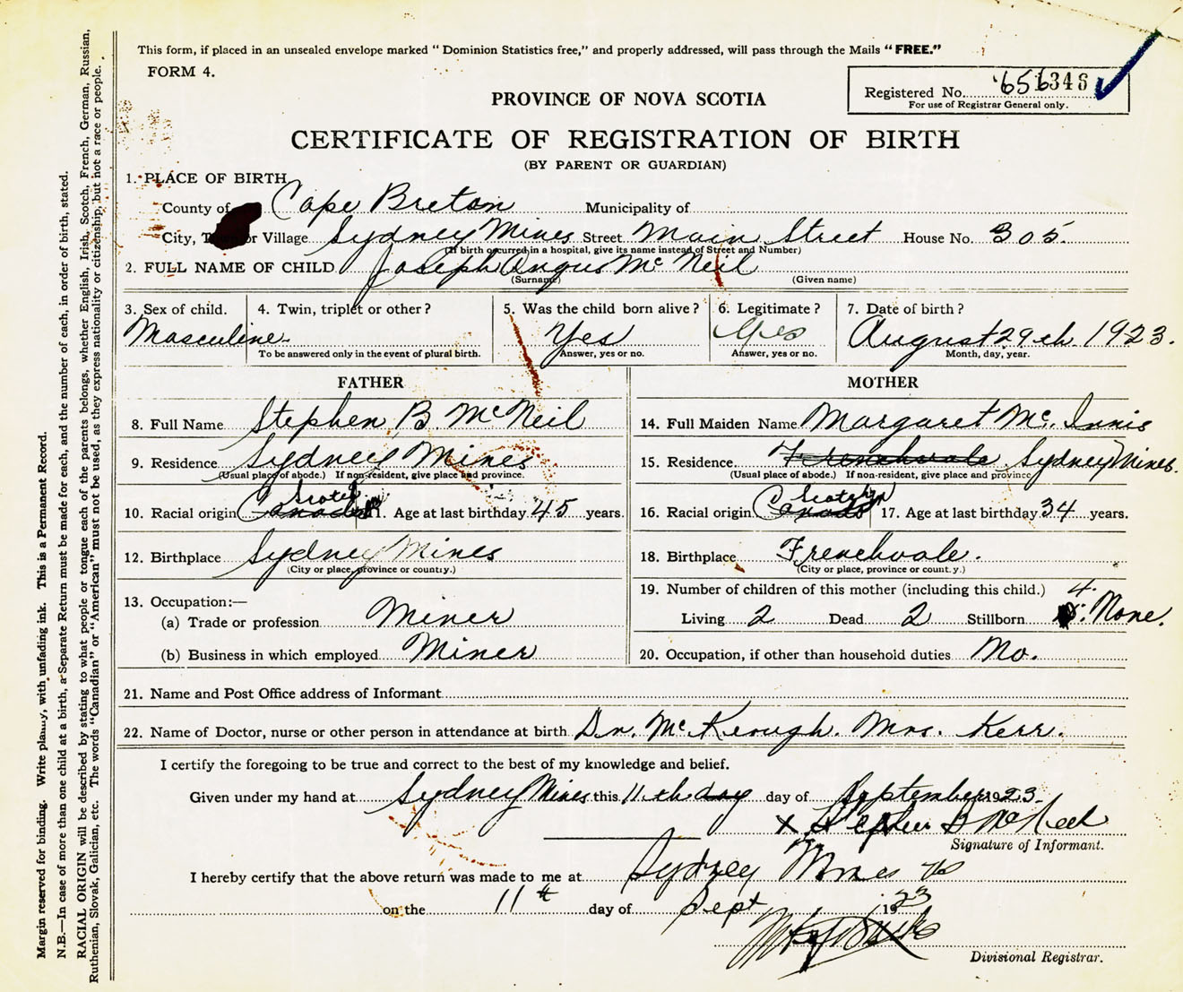 Male Birth Registration: Year: 1923 number: 65600346