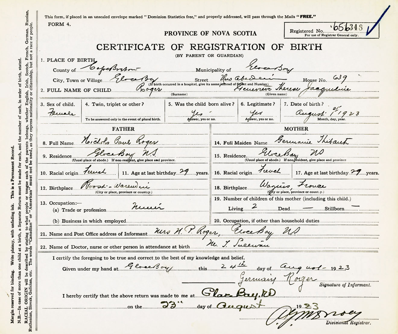 Female Birth Registration: Year: 1923 number: 65600348