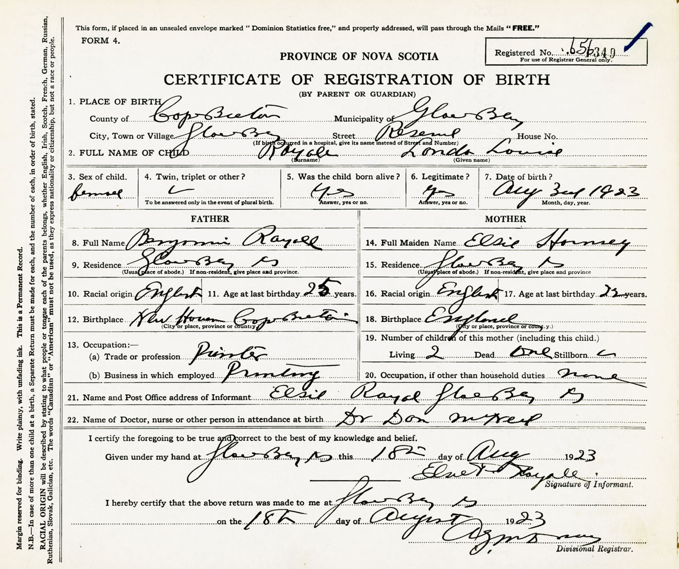 Female Birth Registration: Year: 1923 number: 65600349