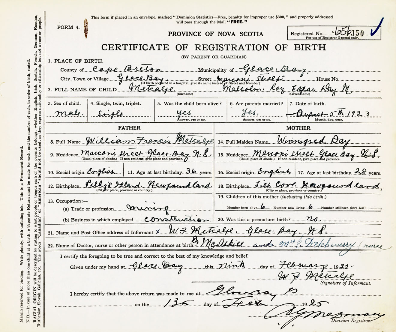 Male Birth Registration: Year: 1923 number: 65600350