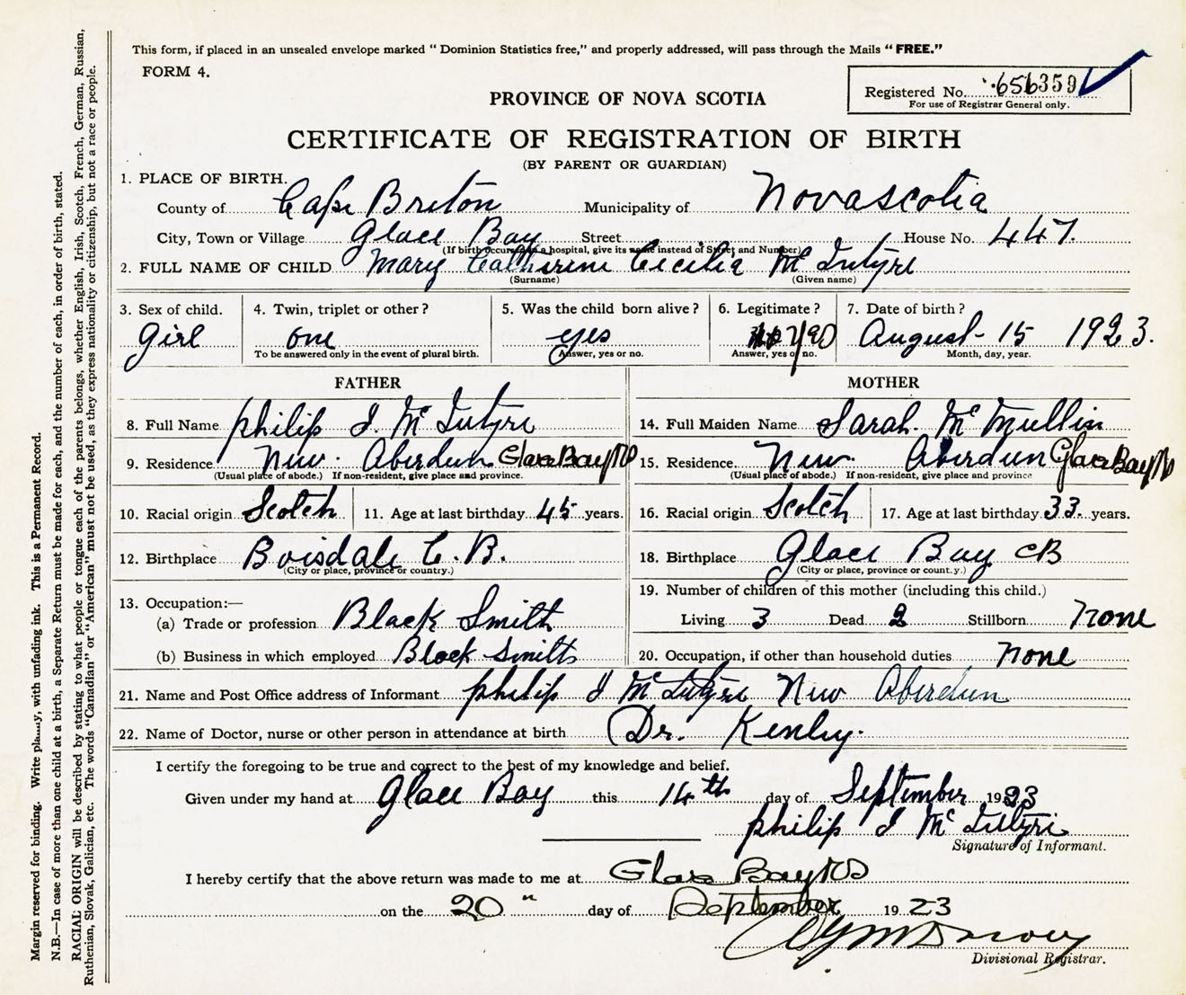 Female Birth Registration: Year: 1923 number: 65600359