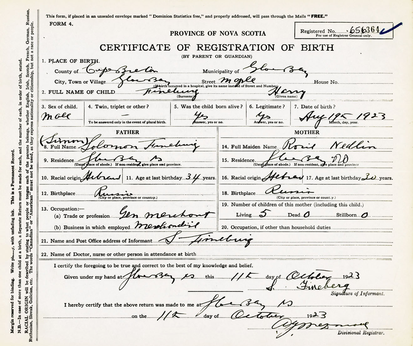 Male Birth Registration: Year: 1923 number: 65600364
