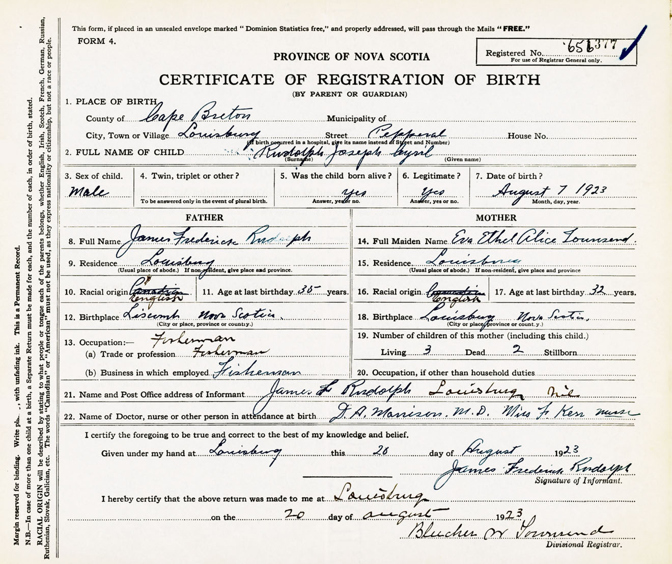 Male Birth Registration: Year: 1923 number: 65600377