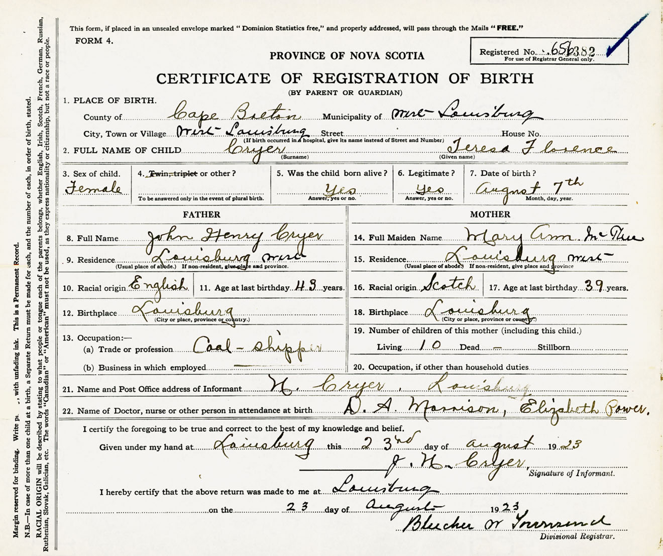 Female Birth Registration: Year: 1923 number: 65600382