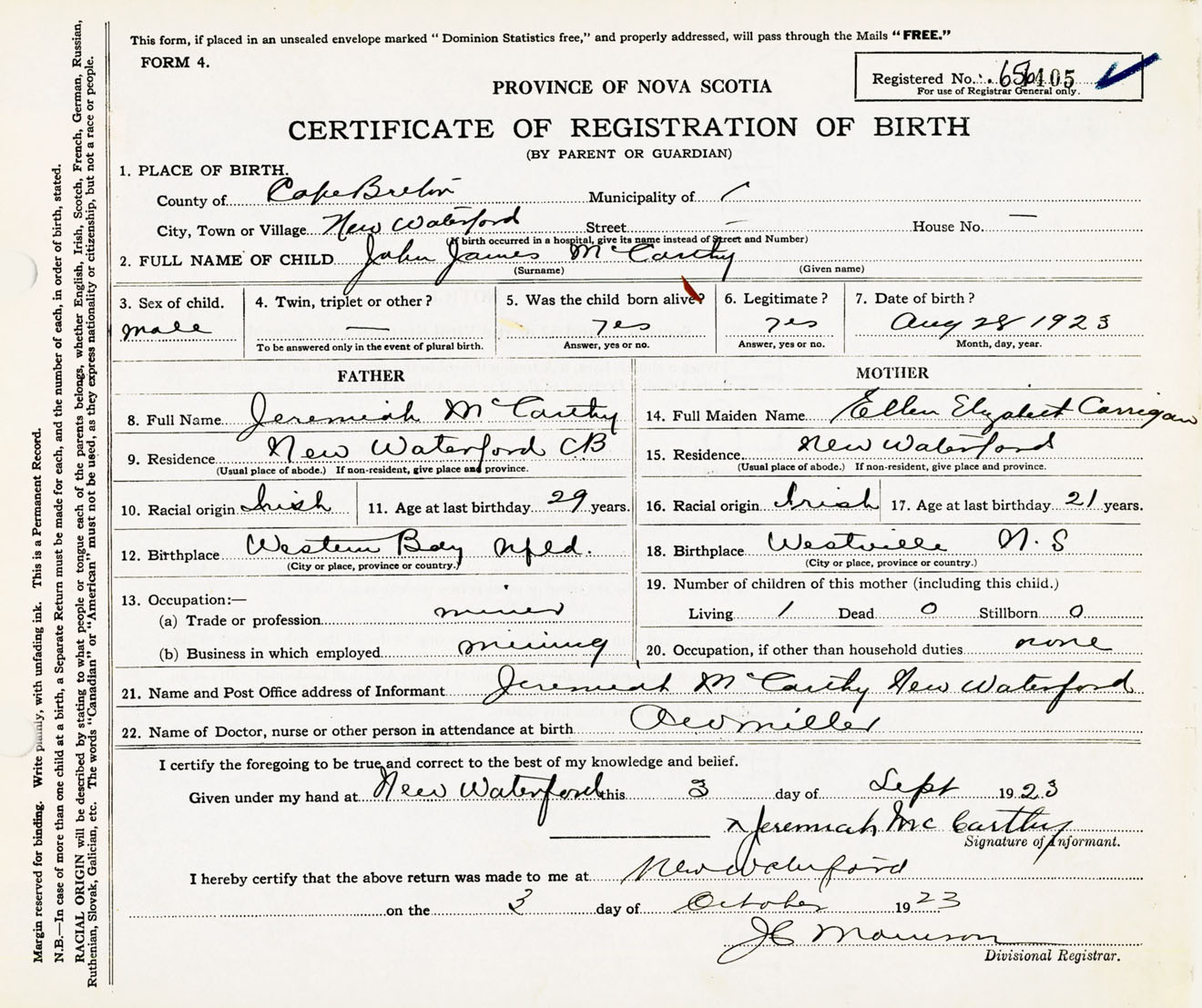 Male Birth Registration: Year: 1923 number: 65600405