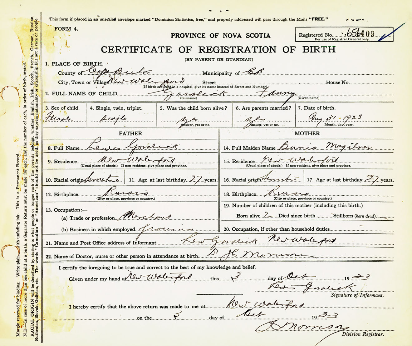 Female Birth Registration: Year: 1923 number: 65600409