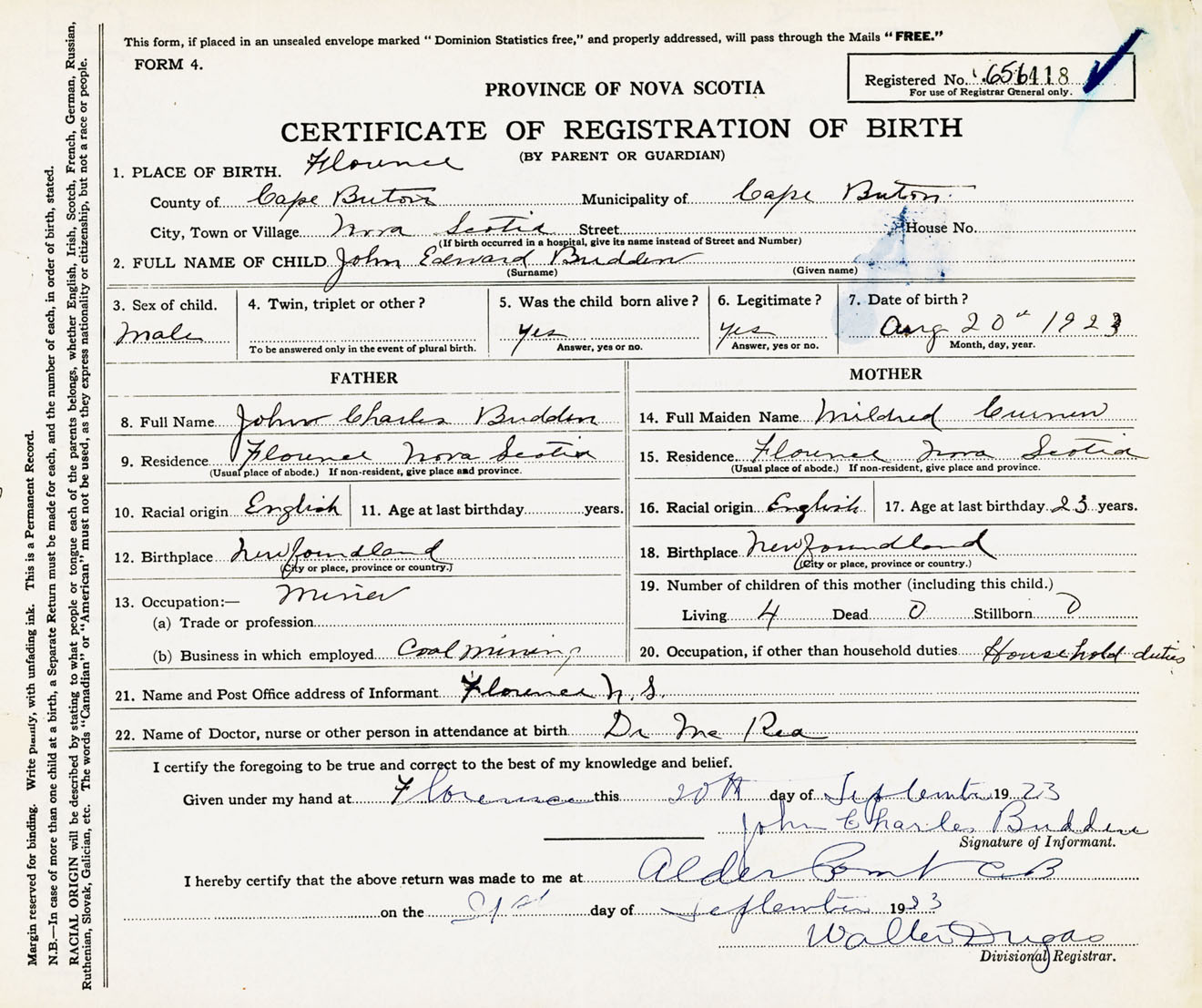 Male Birth Registration: Year: 1923 number: 65600418