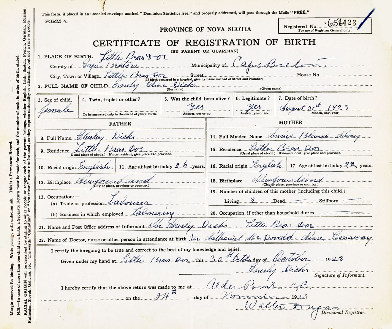 Female Birth Registration: Year: 1923 number: 65600423