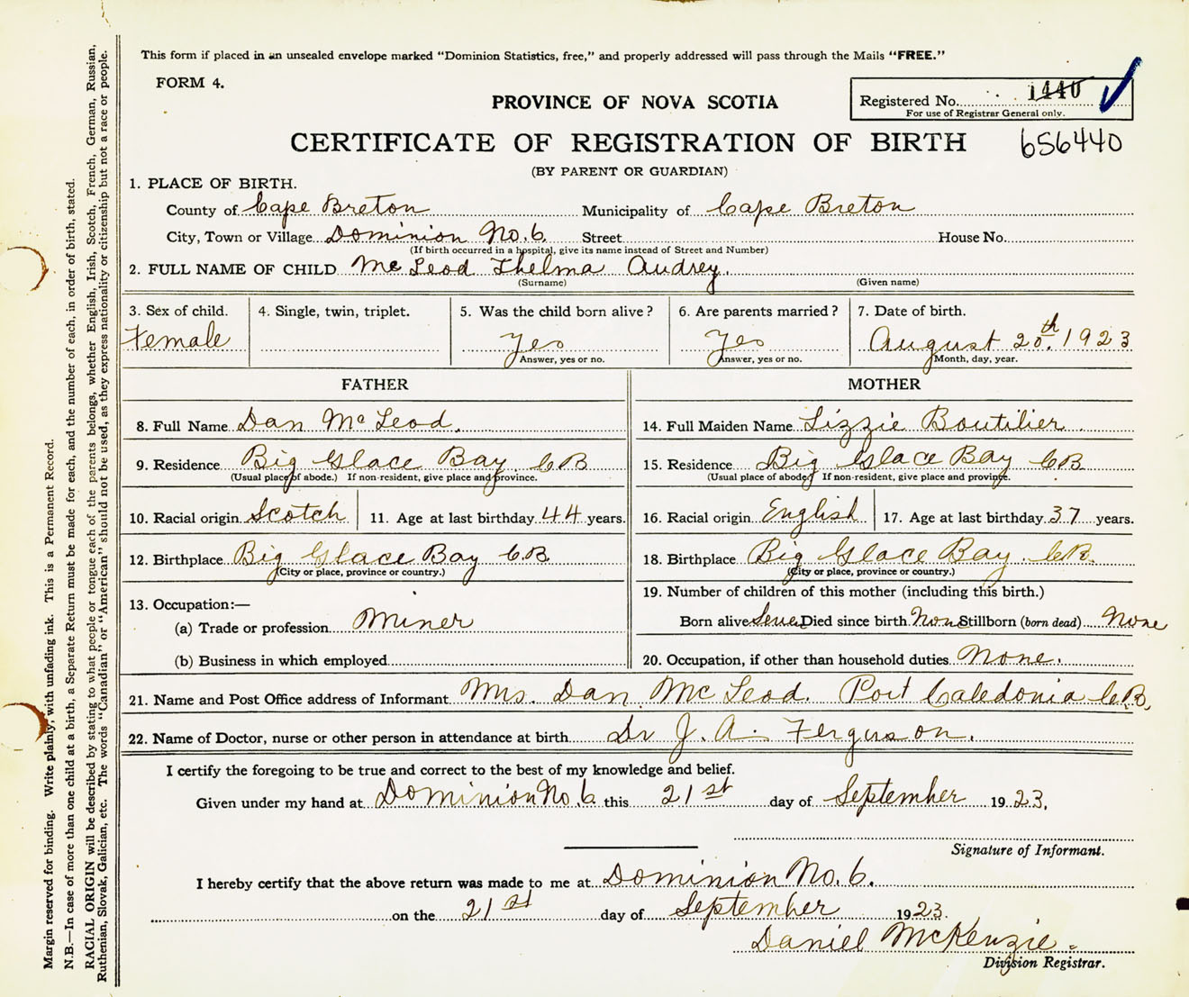 Female Birth Registration: Year: 1923 number: 65600440