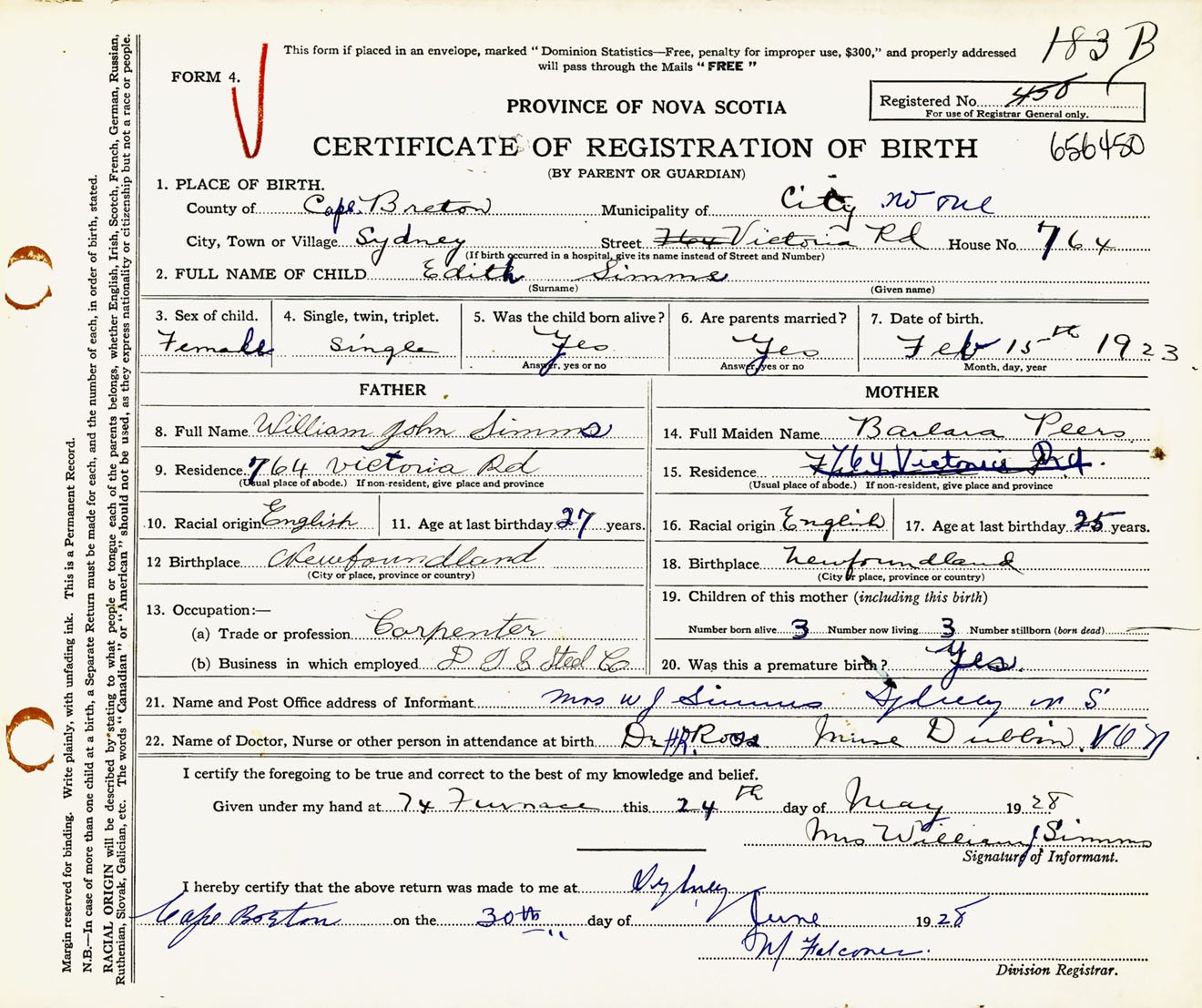 Female Birth Registration: Year: 1923 number: 65600450