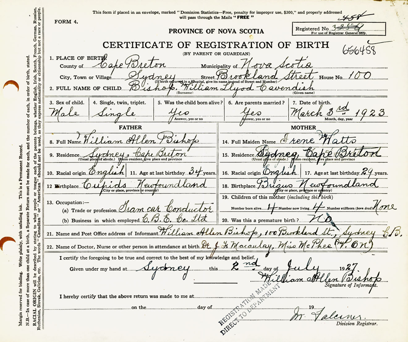 Male Birth Registration: Year: 1923 number: 65600458