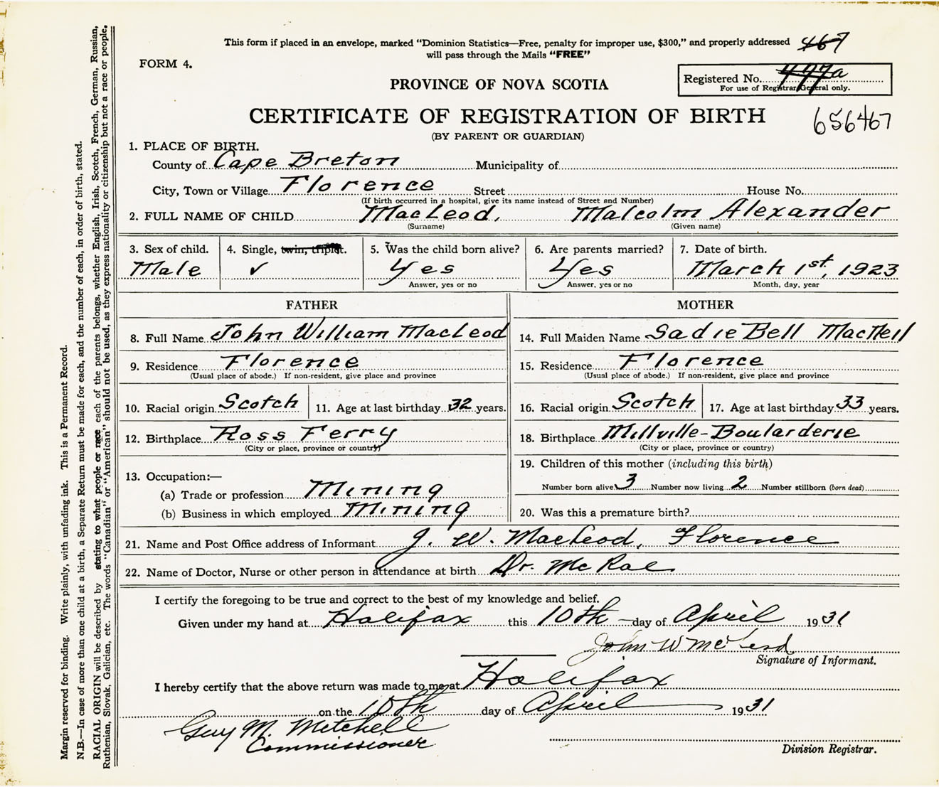 Male Birth Registration: Year: 1923 number: 65600467