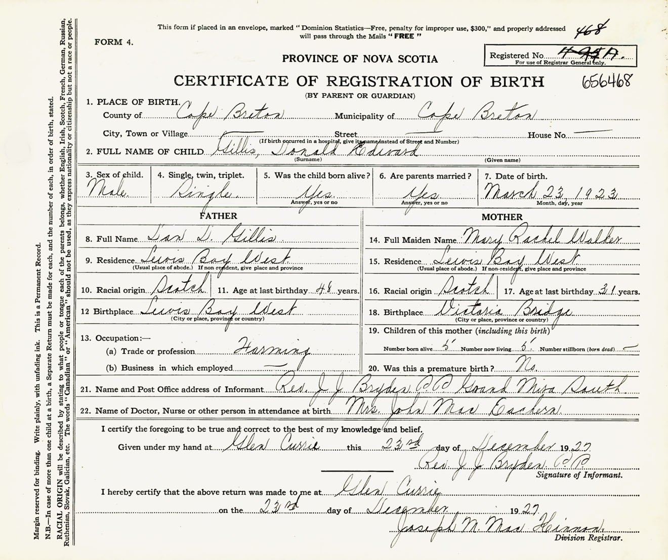 Male Birth Registration: Year: 1923 number: 65600468