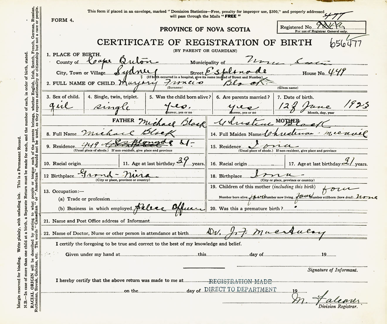 Female Birth Registration: Year: 1923 number: 65600477