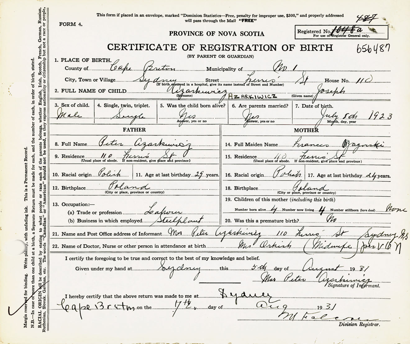 Male Birth Registration: Year: 1923 number: 65600487