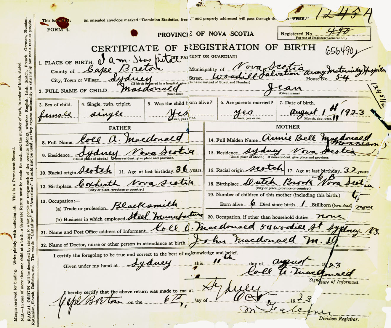 Female Birth Registration: Year: 1923 number: 65600490