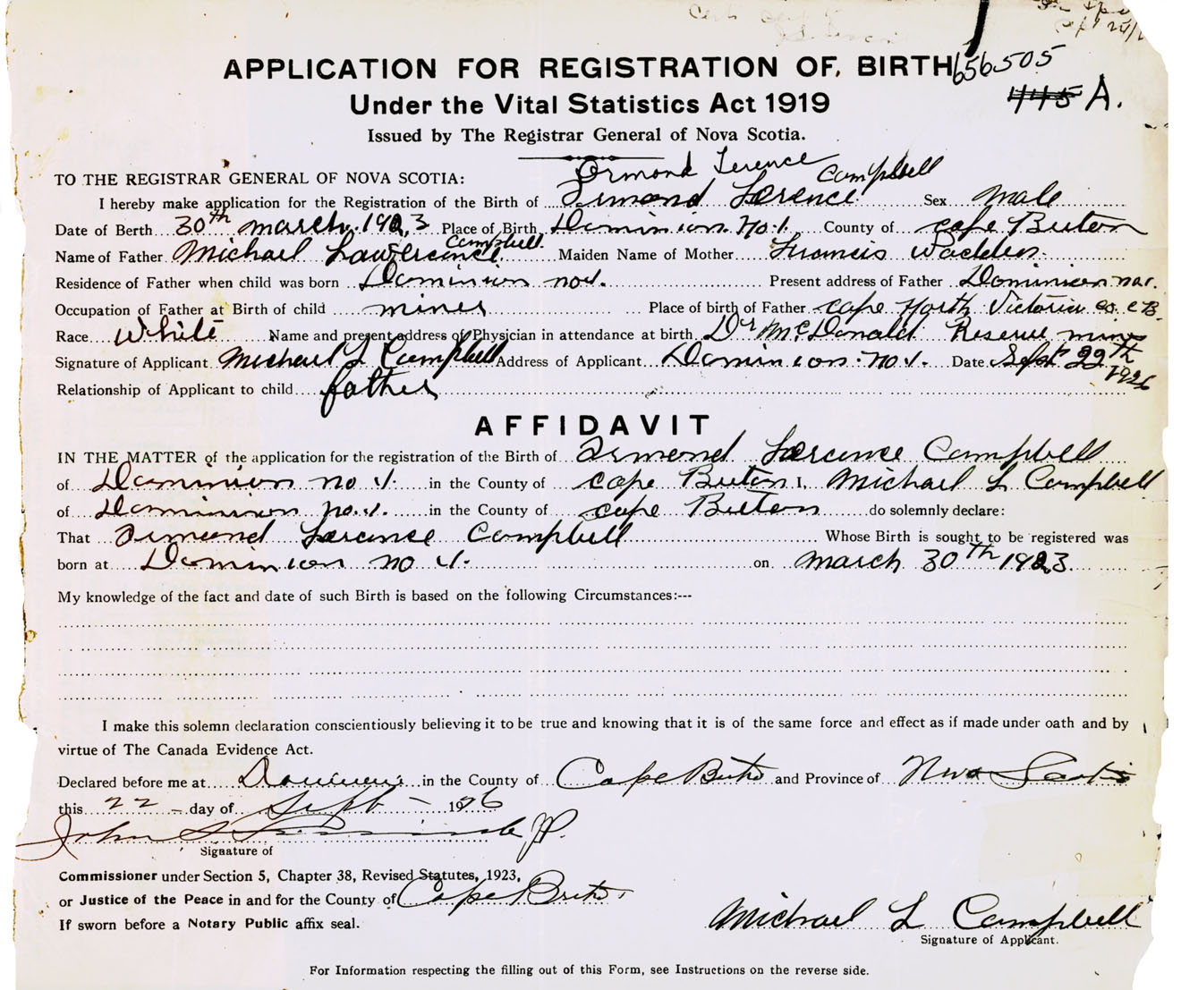 Male Birth Registration: Year: 1923 number: 65600505