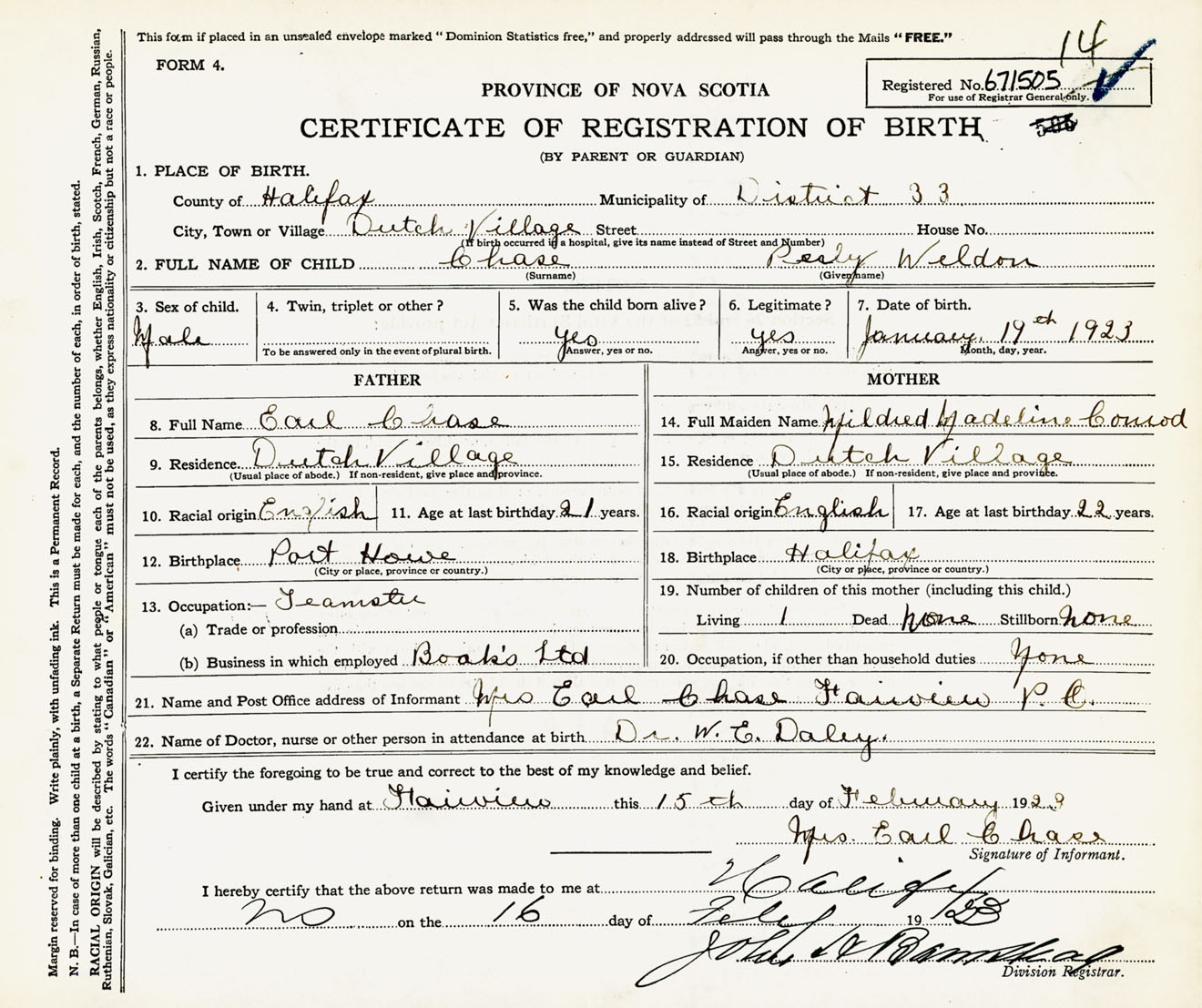 Male Birth Registration: Year: 1923 number: 67100505