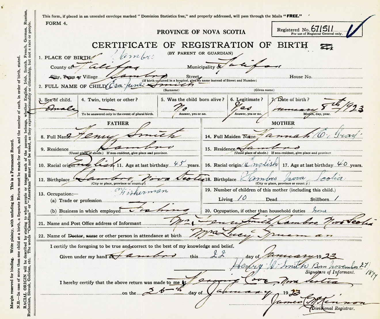 Female Birth Registration: Year: 1923 number: 67100511