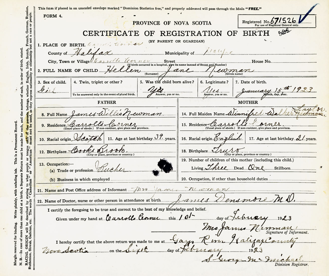 Female Birth Registration: Year: 1923 number: 67100526