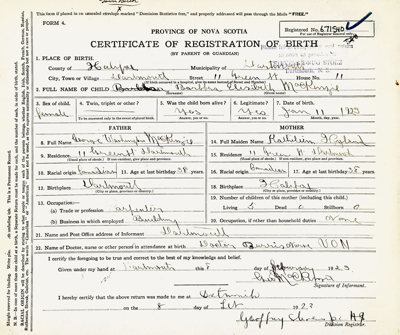 Female Birth Registration: Year: 1923 number: 67100540