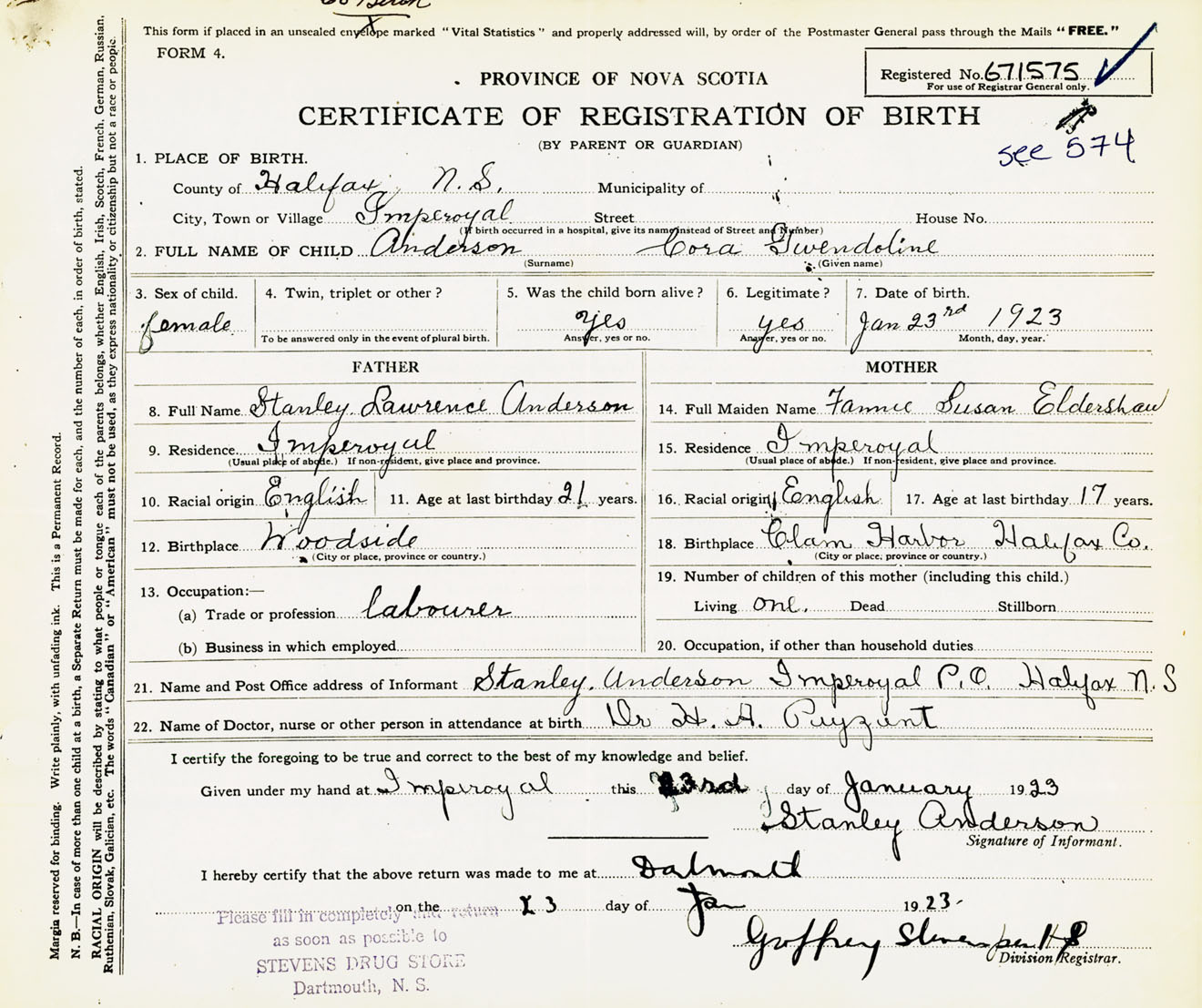 Female Birth Registration: Year: 1923 number: 67100575
