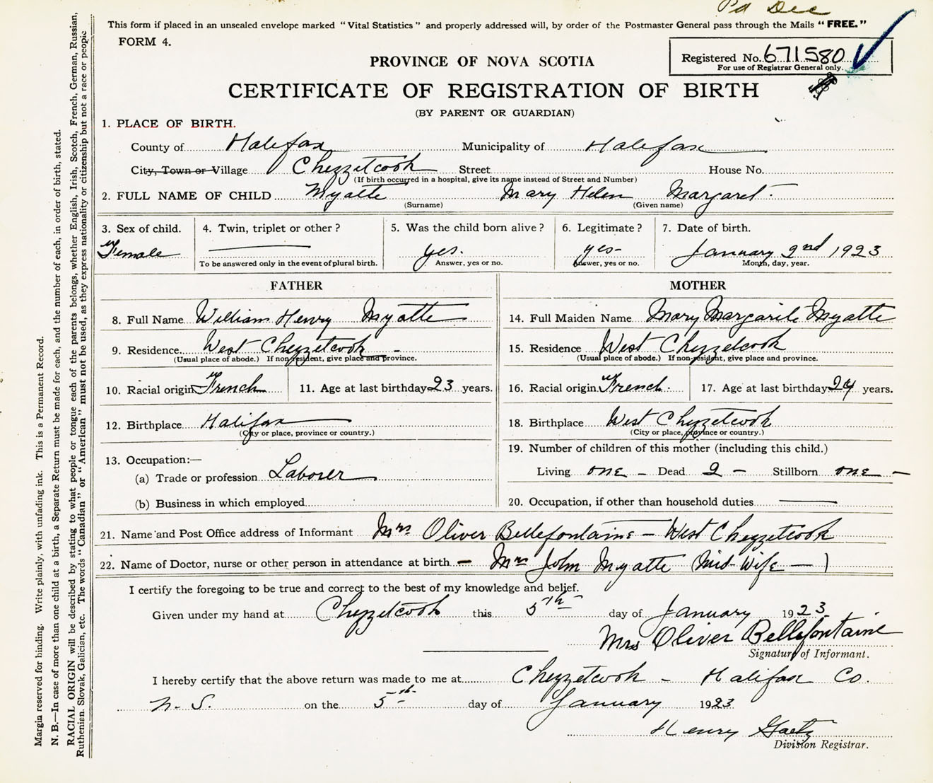 Female Birth Registration: Year: 1923 number: 67100580