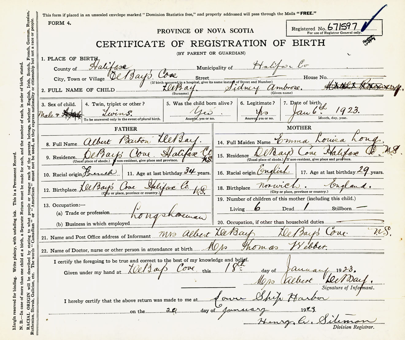Male Birth Registration: Year: 1923 number: 67100597