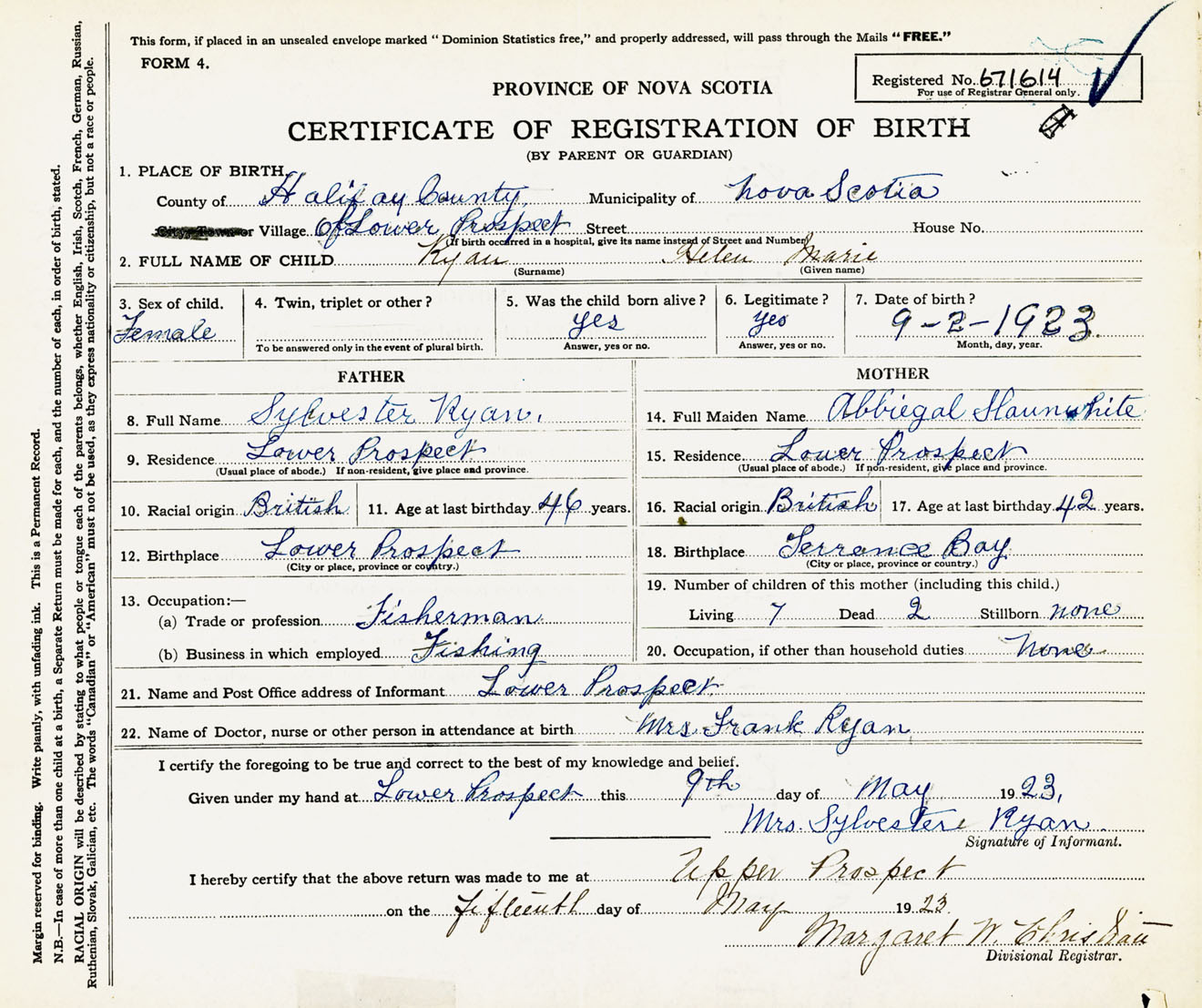 Female Birth Registration: Year: 1923 number: 67100614
