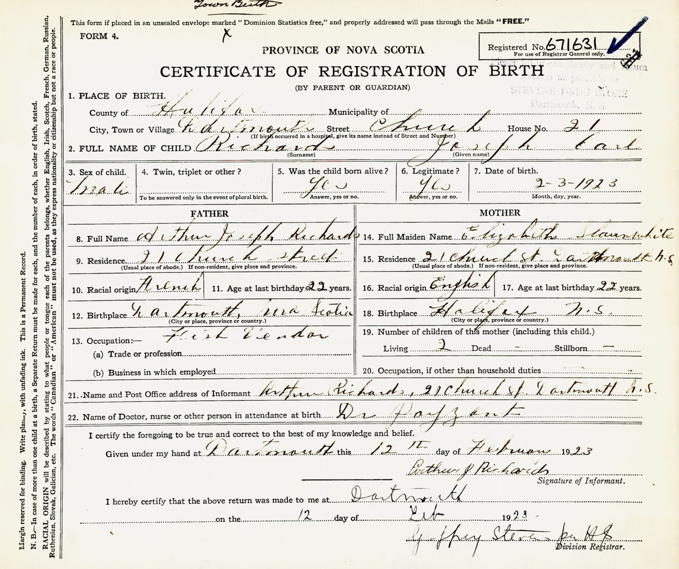Male Birth Registration: Year: 1923 number: 67100631