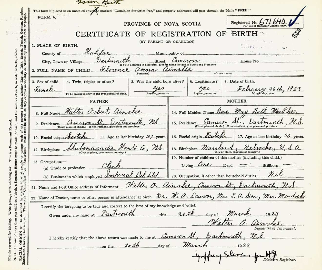 Female Birth Registration: Year: 1923 number: 67100640