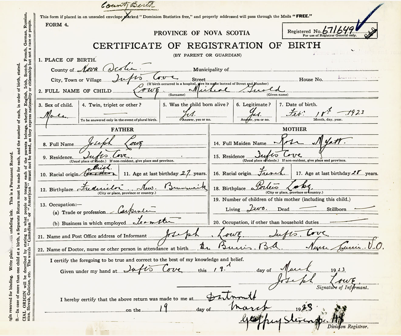 Male Birth Registration: Year: 1923 number: 67100649