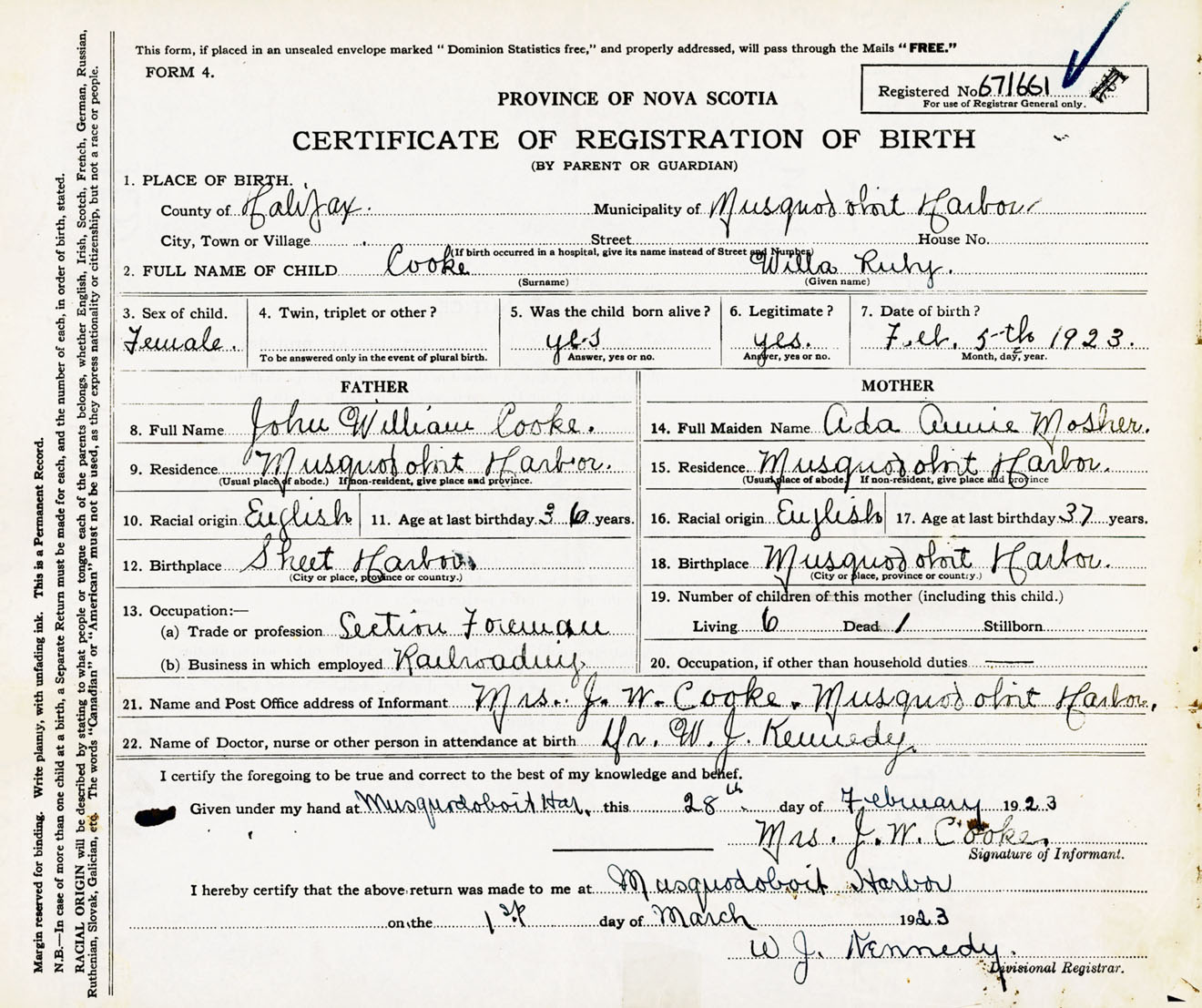 Female Birth Registration: Year: 1923 number: 67100661