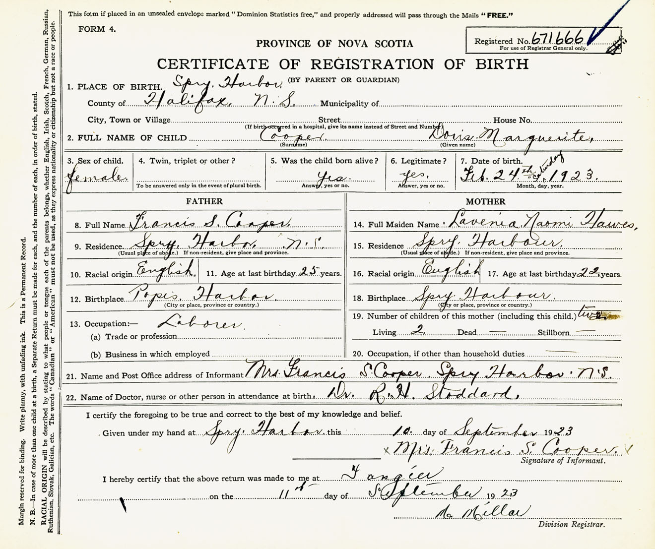 Female Birth Registration: Year: 1923 number: 67100666