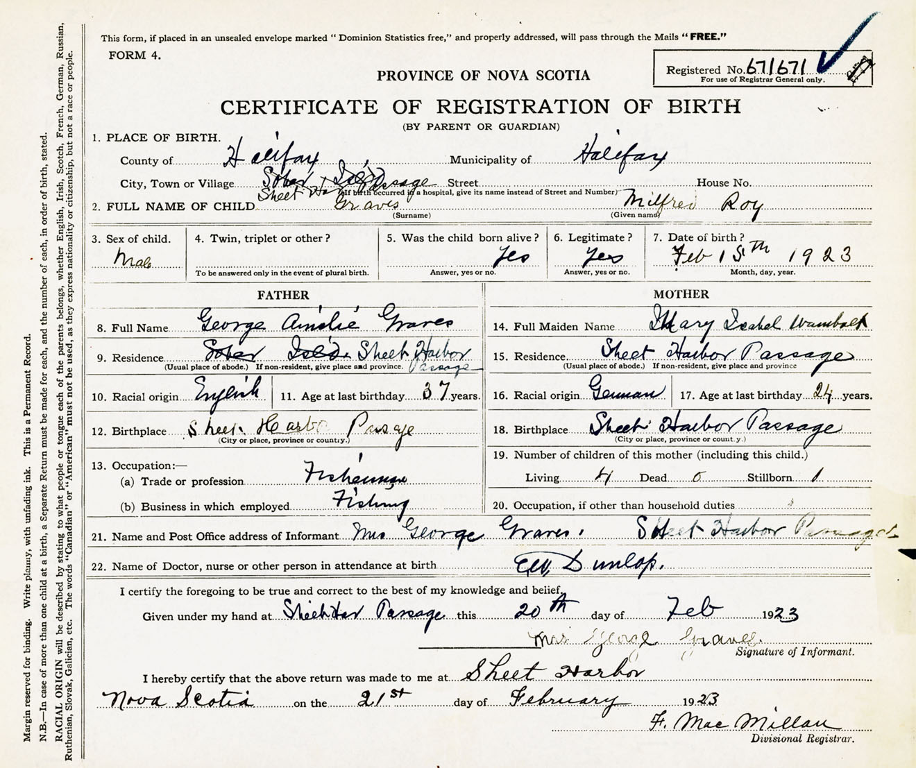Male Birth Registration: Year: 1923 number: 67100671