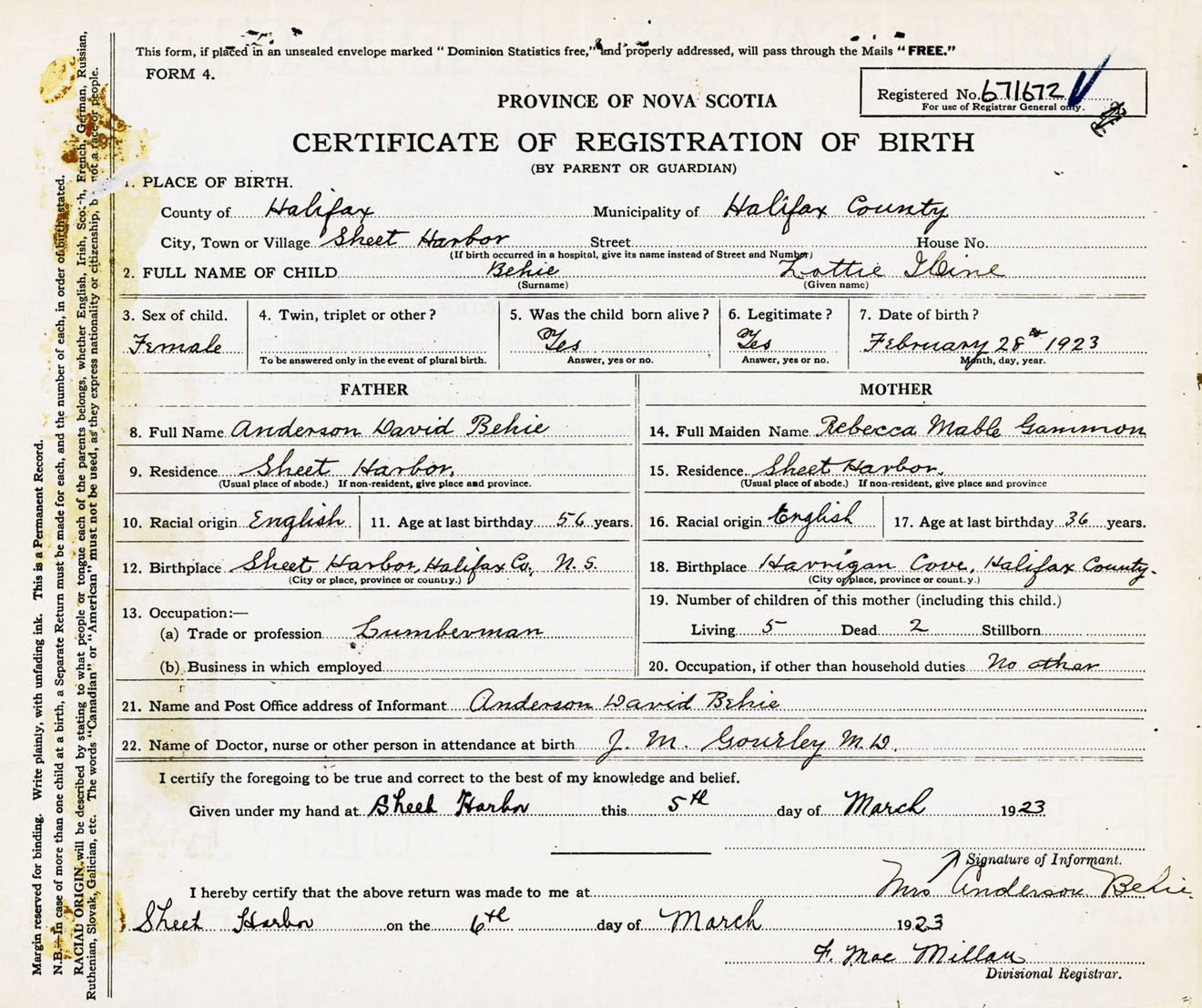 Female Birth Registration: Year: 1923 number: 67100672