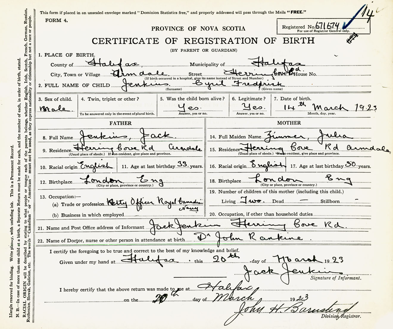Male Birth Registration: Year: 1923 number: 67100674