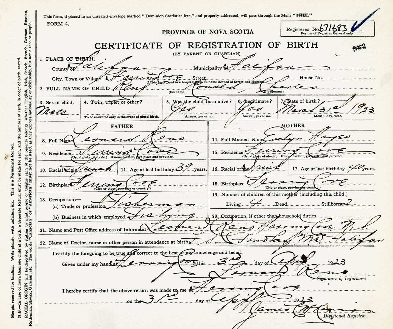 Male Birth Registration: Year: 1923 number: 67100683