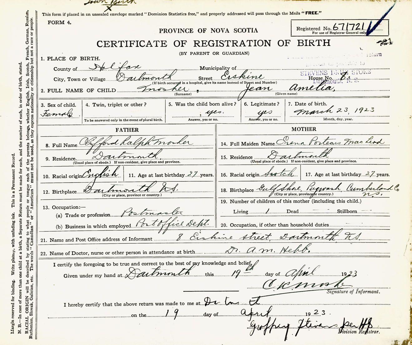 Female Birth Registration: Year: 1923 number: 67100721