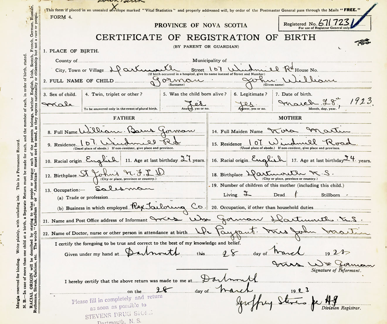 Male Birth Registration: Year: 1923 number: 67100723