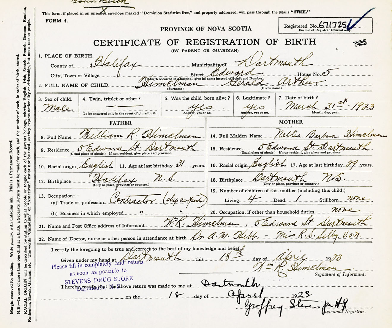 Male Birth Registration: Year: 1923 number: 67100725