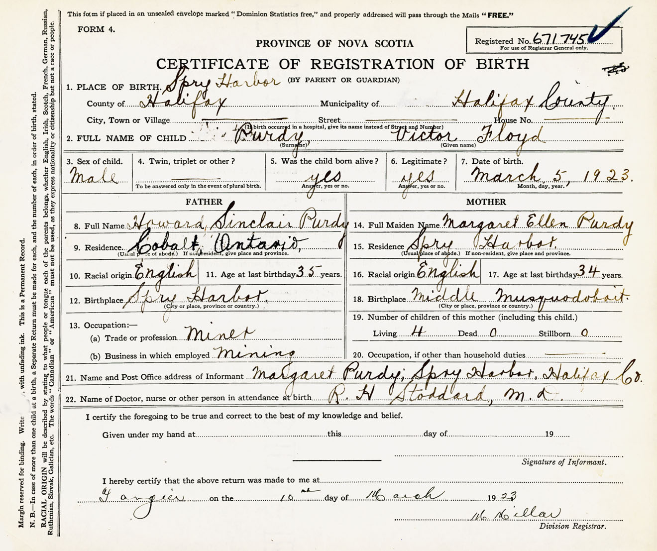 Male Birth Registration: Year: 1923 number: 67100745