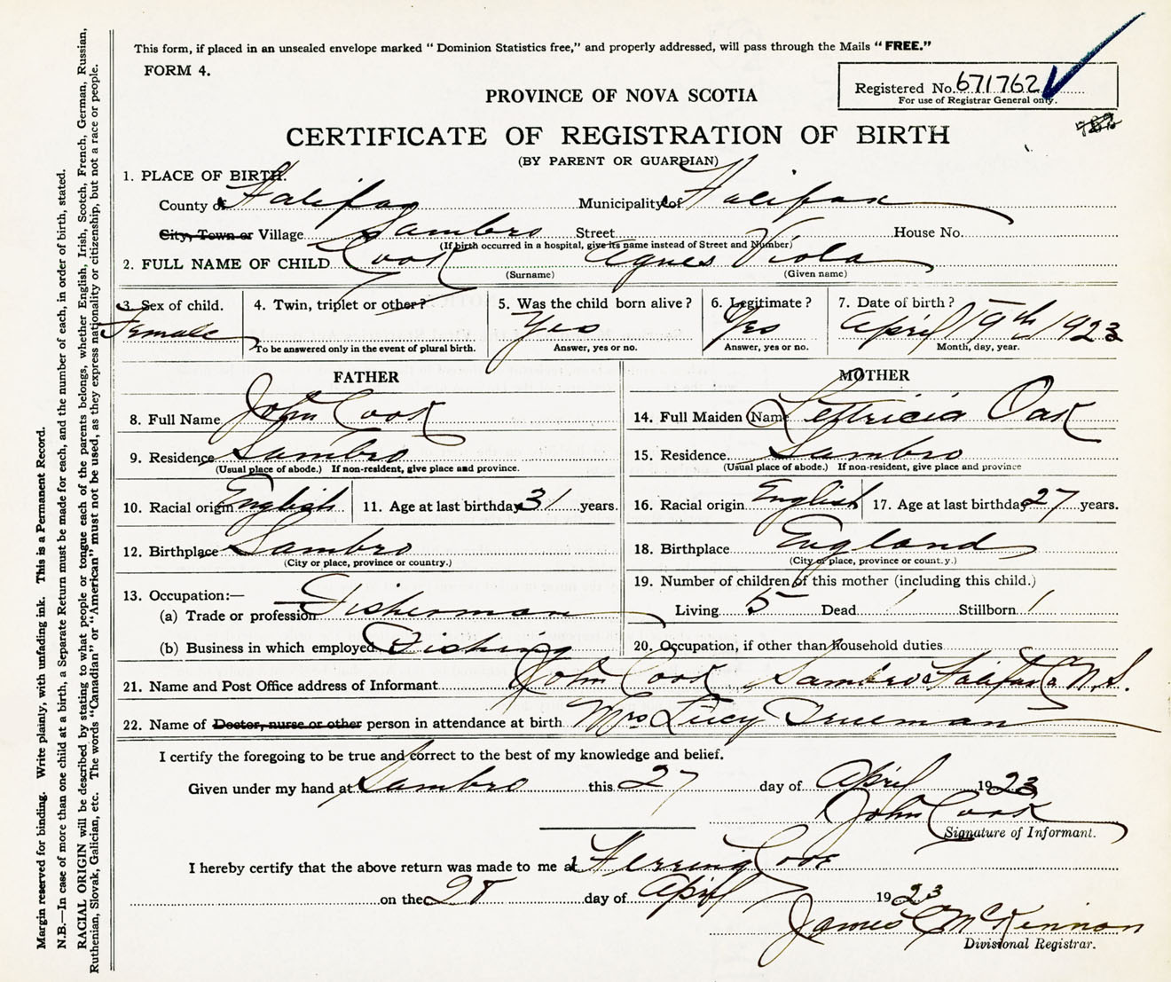 Female Birth Registration: Year: 1923 number: 67100762