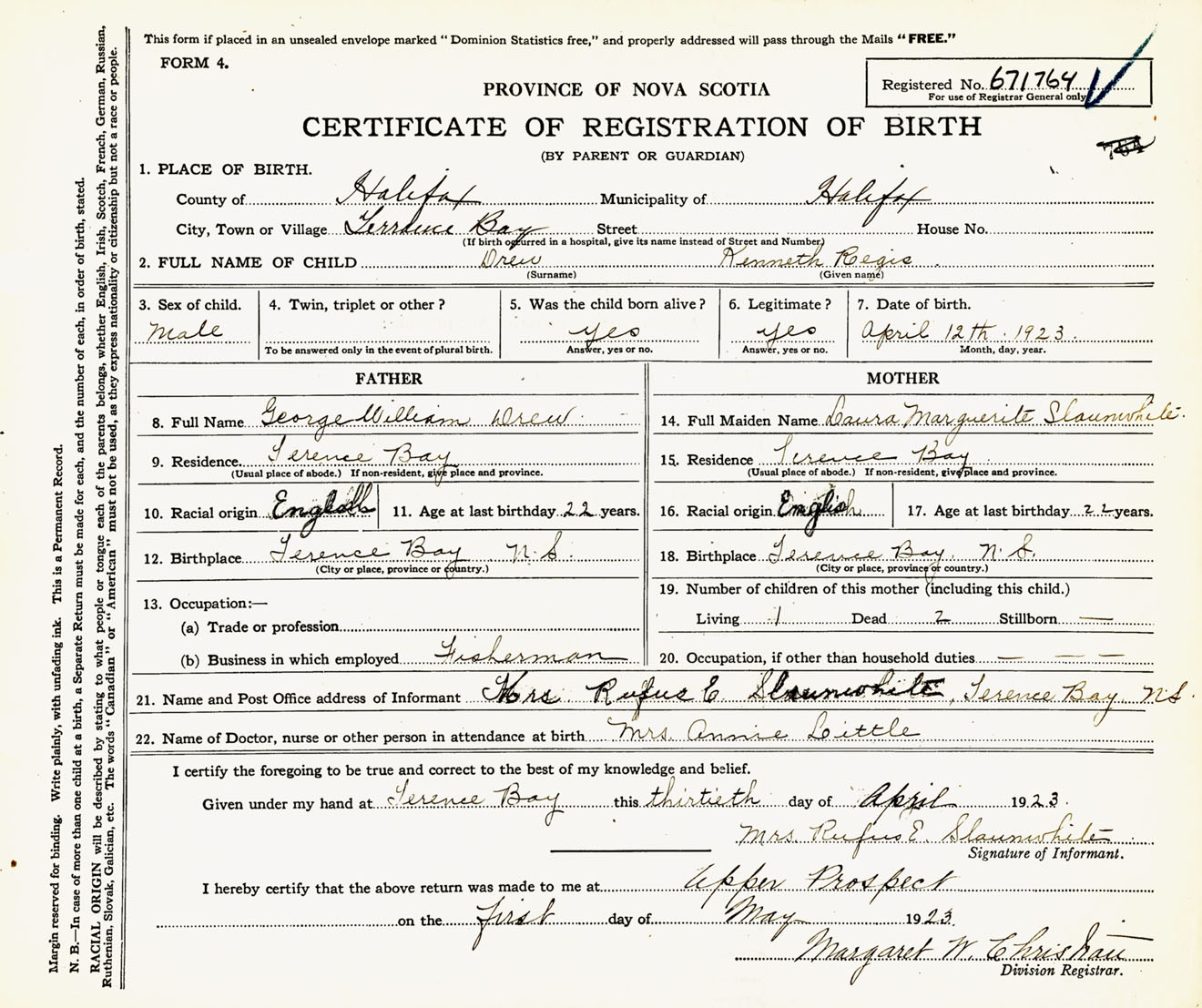 Male Birth Registration: Year: 1923 number: 67100764
