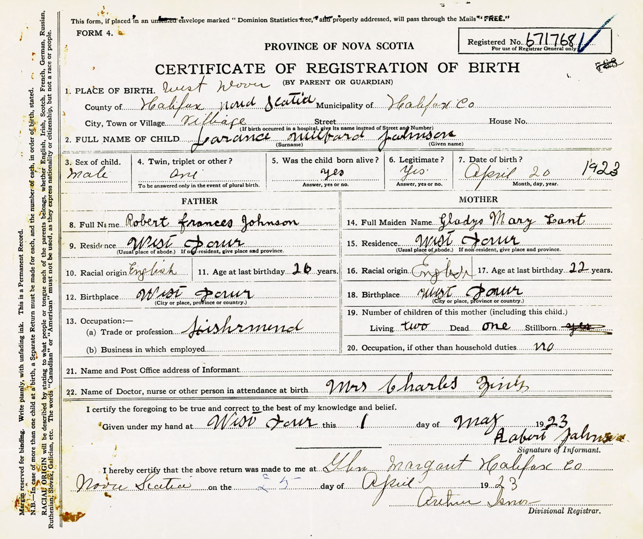Male Birth Registration: Year: 1923 number: 67100768